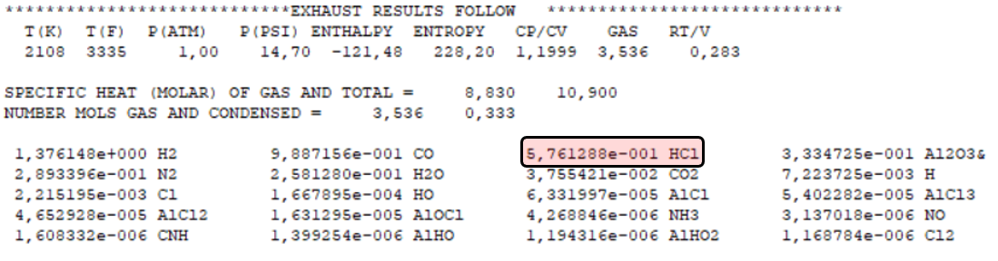 As emissões de HCl foram analisadas com o software PROPEP 3, um programa de equilíbrio químico amplamente usado para simular gases de exaustão de propelentes [5]. As simulações foram conduzidas sob condições de 298 K, 1000 PSI e 1 atm, fornecendo a quantidade de moles de cada espécie química por 100 g de propelente queimado.